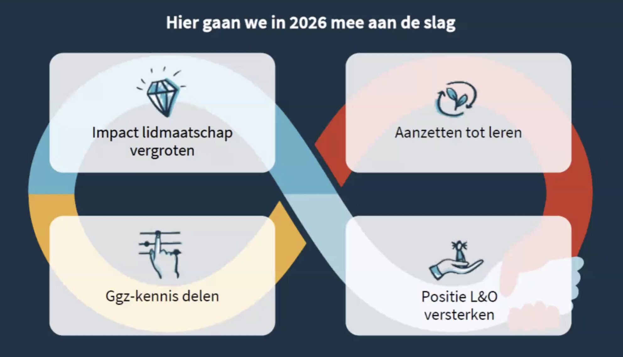 We continueren wat goed loopt, maken ruimte voor innovatie en zetten bewuste stappen richting de toekomst. We sluiten aan op veranderende behoeftes van leden, lerenden en L&O-professionals. We brengen focus aan en bewaken effectiviteit.